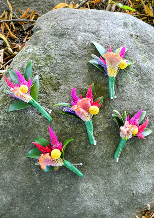 2. The groom and groomsmen flowers will reflect what's in the girls' bouquets. Maybe a flower or two that will find itself repeated in the guys bouts, usually one of the smaller flowers as it needs to fit on their lapel or suspender.